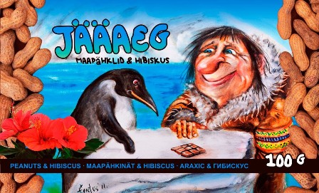 Valge šokolaad maapähklite ja hibiskusega. Šokolaad on naturaalse hibiskuse koostises kasutamise tõttu, tumeroosat värvi.