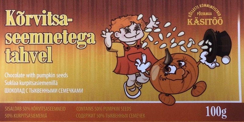 Tume šokolaad röstitud kõrvitsaseemnetega. Üks tahvel sisaldab 40% kõrvitsaseemneid.