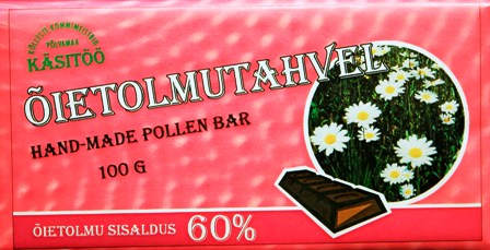 Tume šokolaad õietolmuga. Šokolaad sisaldab 60 g kuivatatud õietolmu.